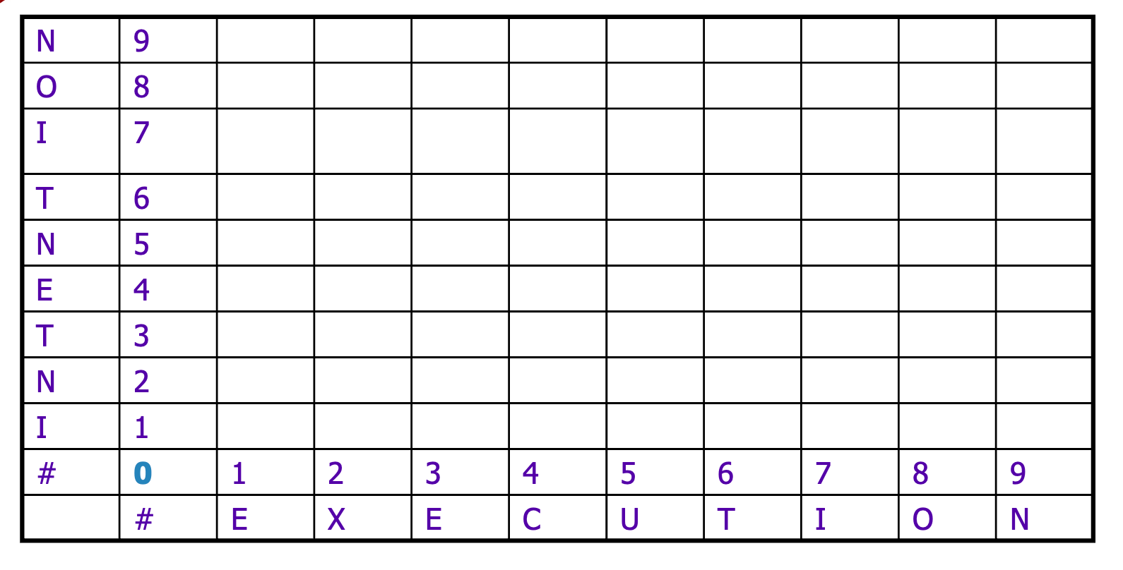 - Với hàng đầu tiên, các giá trị đại diện cho chuỗi bắt đầu là chuỗi “#” và phép biến đổi là thêm (insert) từ chuỗi “#” thành “#”, “#y”,“#yo”, “#you” lần lượt là 0, 1, 2, 3 tương ứng với ô D[0, 0], D[0, 1], D[0, 2], D[0, 3].