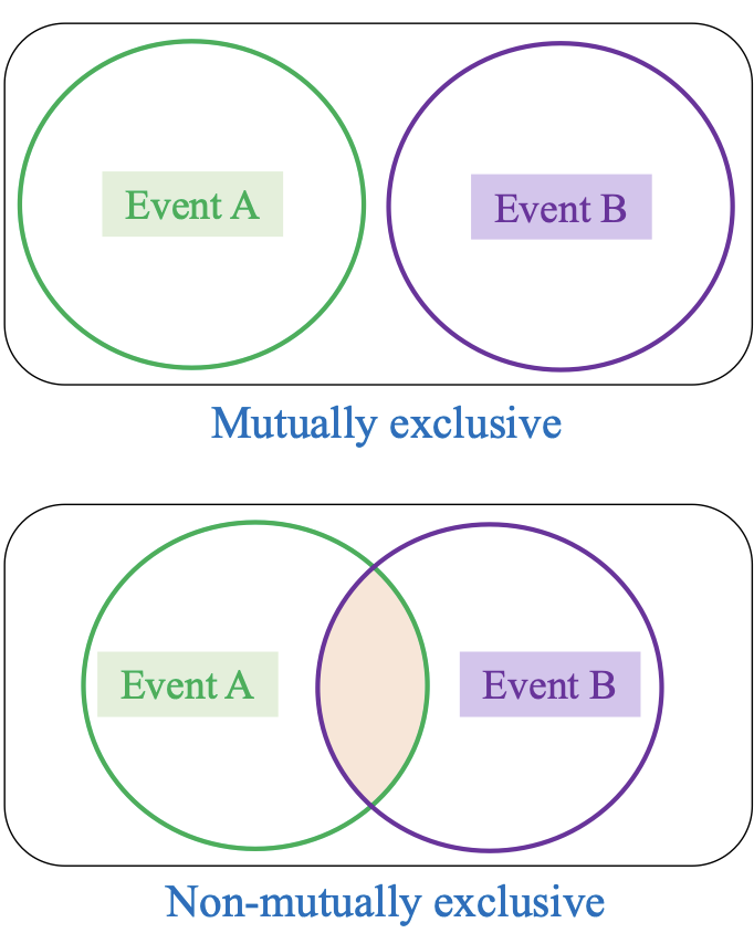 |Non-mutually exclusive events|A∩B≠∅|Có thể xảy ra đồng thời (có phần tử chung)|