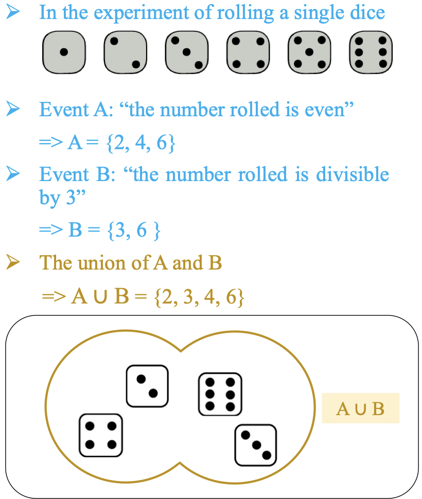 Định nghĩa: Phép hợp (Union): là tập hợp các kết quả thuộc A, hoặc thuộc B, hoặc cả hai. Ký hiệu là (A ∪ B) hay (A or B).