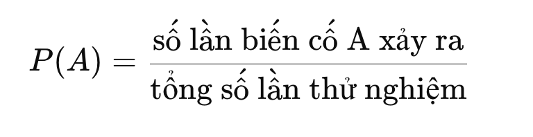 Theo lý thuyết xác suất cổ điển, xác suất của một biến cố A được tính bằng cách lấy số lần biến cố A xảy ra chia cho tổng số lần xảy ra của tất cả các biến cố.