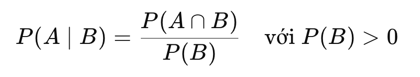 | Có điều kiện | P(A∣B)=P(A∩B)P(B) |