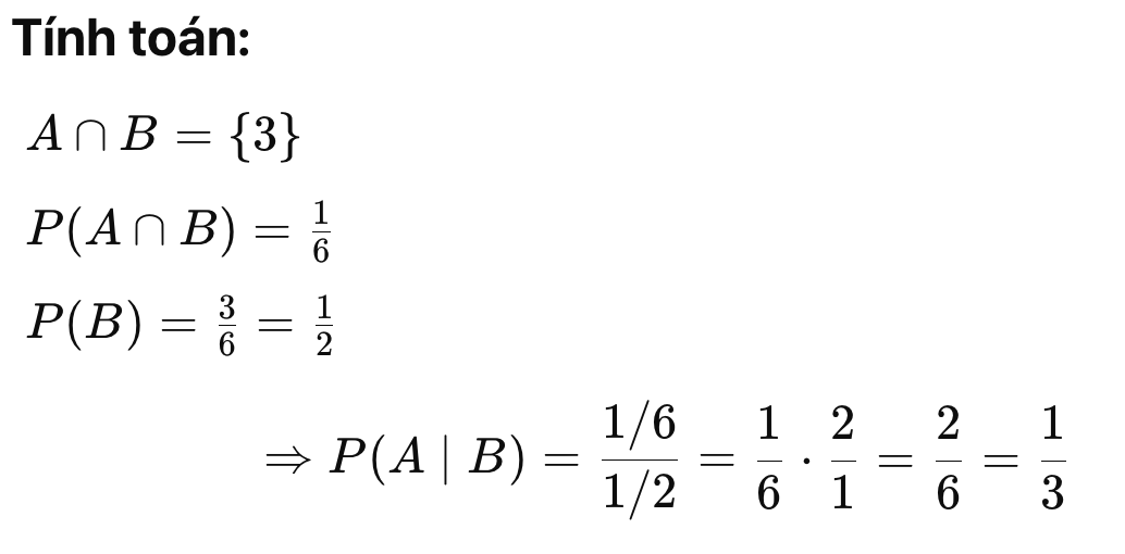Ý nghĩa trực quan: - Nếu bạn biết trước rằng B xảy ra (ra số chẵn), thì khả năng A xảy ra tăng lên (vì 4 nằm trong B).