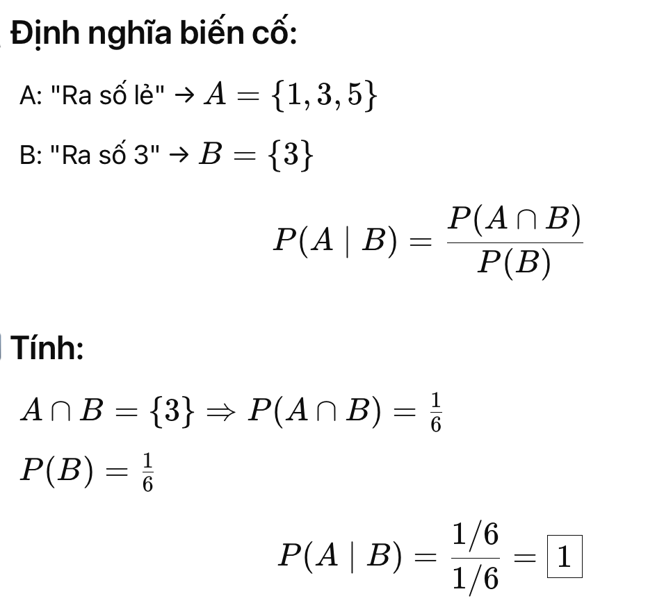 |b) P(số lẻ | 3)|1|Nếu biết là ra 3, thì chắc chắn là số lẻ|
