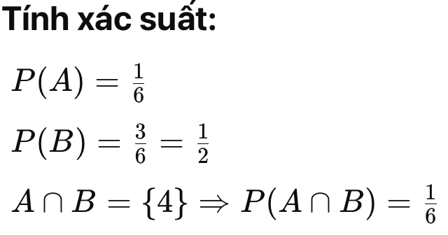 Biến cố Tập kết quả P(A) Ra số chẵn {2, 4, 6} 3/6 = 0.5 Ra số > 4 {5, 6} 2/6 = 1/3 Ra số < 3 {1, 2} 2/6 = 1/3 Ra số nguyên tố {2, 3, 5} 3/6 = 0.5 Ra số là 1 {1} 1/6 ≈ 0.1667 -