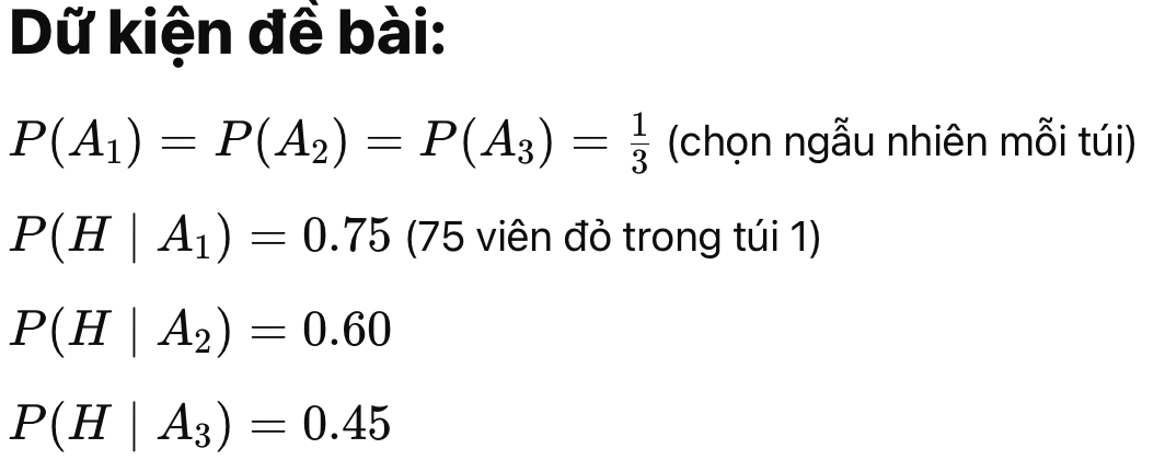 Biết rằng viên bi chọn ra là đỏ, hỏi: xác suất nó đến từ túi 1 là bao nhiêu?