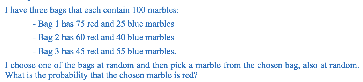 Mỗi túi có 100 viên bi, và chọn ngẫu nhiên một túi rồi lấy 1 viên bi từ túi đó. -