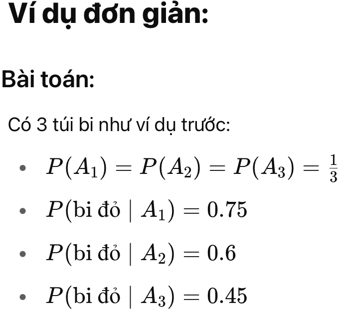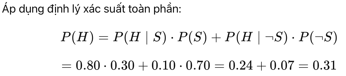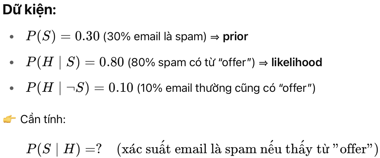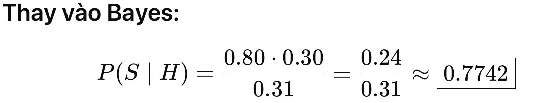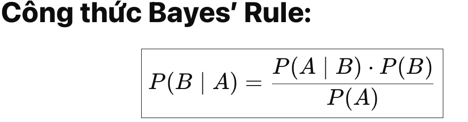 | P(B∣A) | Xác suất hậu nghiệm (posterior): Xác suất B đúng khi biết A đúng |