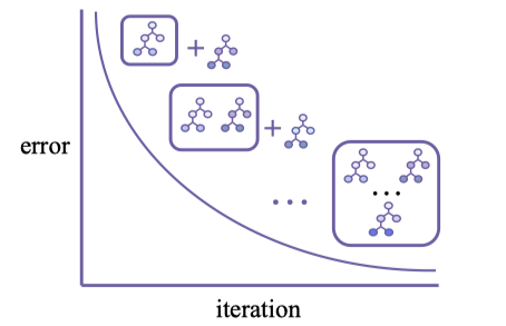 Gradient Boosting là một phương pháp ensemble theo từng bước (stage-wise ensemble), xây dựng bộ dự đoán mạnh bằng cách cộng dồn tuần tự các weak learners (thường là các cây quyết định nông). Ở mỗi vòng lặp, thuật toán khớp một cây mới vào (pseudo-)residuals hiện tại và thêm nó vào mô hình với một learning rate nhỏ, nhờ đó giảm dần loss qua từng bước.