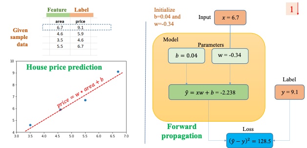 Từ Input x = 6.7 và hai giá trị b = 0.04 và w = -0.34 khởi tạo trước ta tính được = -2.238. Theo Label (giá trị test) thì ta tính được Loss = 128.5