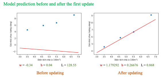 Từ Loss ta cập nhật trọng số sẽ có được b = 0.26676 và w = 1.17929 Bước này có thể gọi là Backpropagation