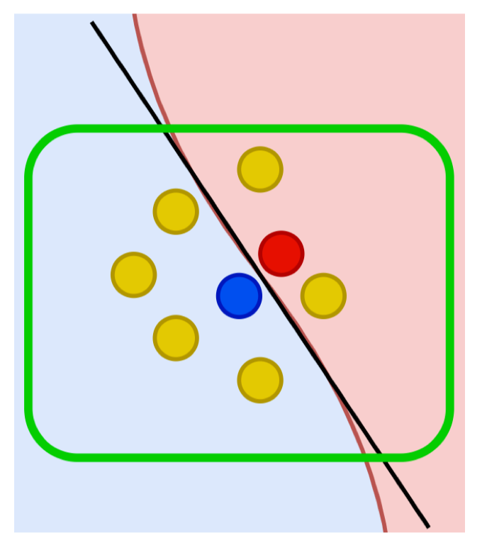 • Tuy nhiên, nếu chỉ xét một vùng nhỏ quanh một điểm dữ liệu cụ thể (G), thì ranh giới ở khu vực đó có thể được xấp xỉ bằng một mô hình đơn giản – ví dụ như một đường thẳng.