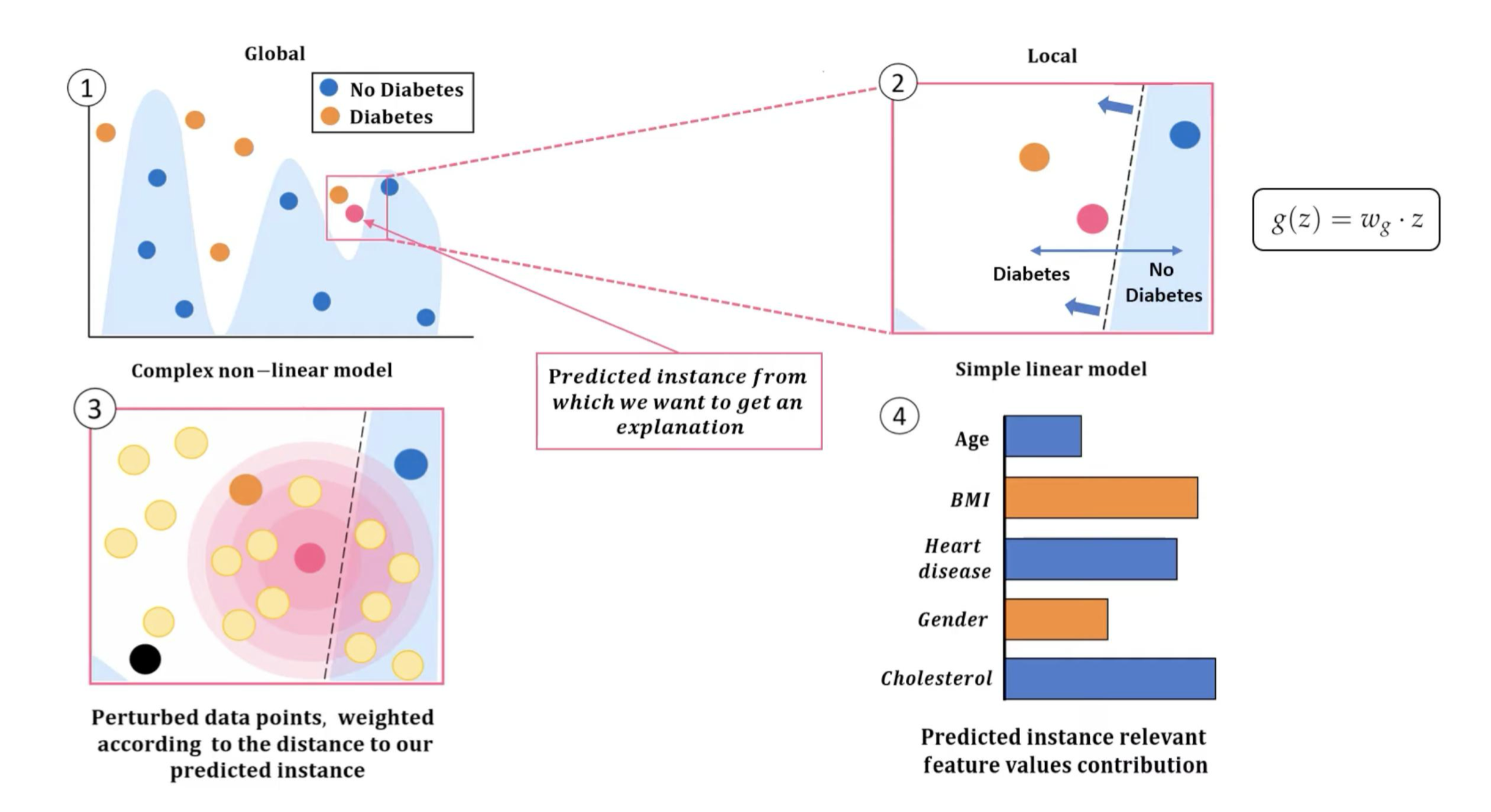 Giải thích mô hình phức tạp bằng cách huấn luyện một mô hình tuyến tính đơn giản quanh điểm cần giải thích để mô phỏng hành vi cục bộ của mô hình gốc.