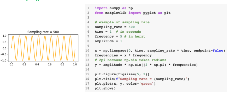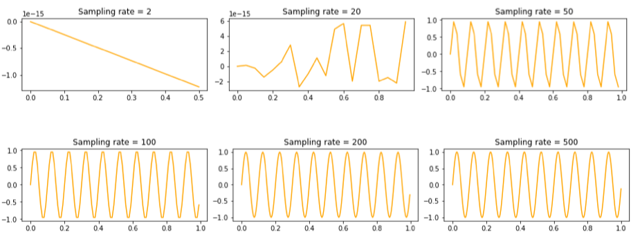 Đây là ví dụ trực quan thể hiện khi ta lấy mẫu theo các sampling rate khác nhau thì dạng sóng sẽ thay đổi như nào. Ở đây ta thấy với Sampling rate = 100, 200, 500 thì là đủ tốt và càng tăng thì không có thay đổi nhiều nên ta có thể chọn 100 là tối ưu.