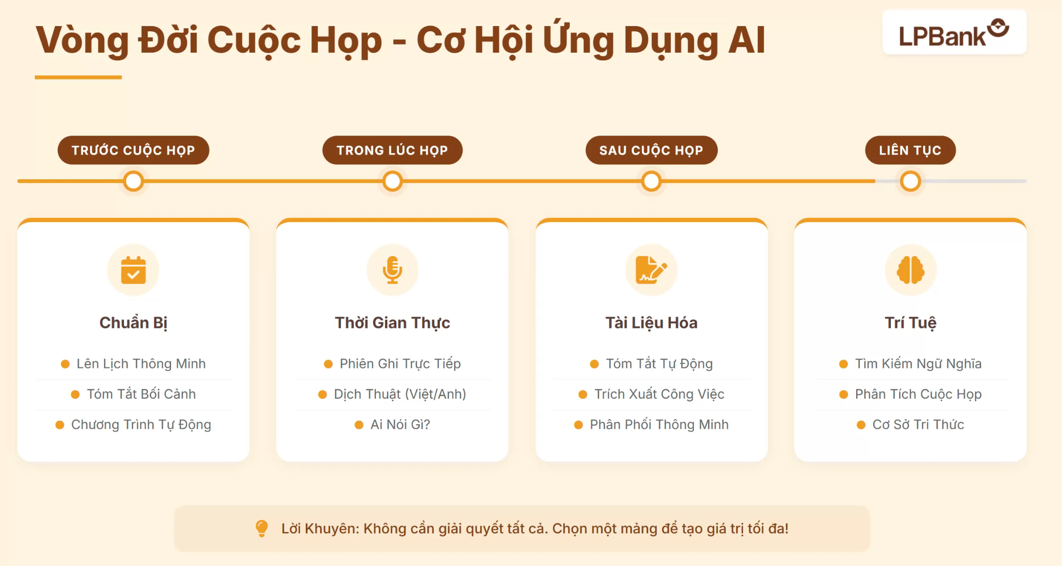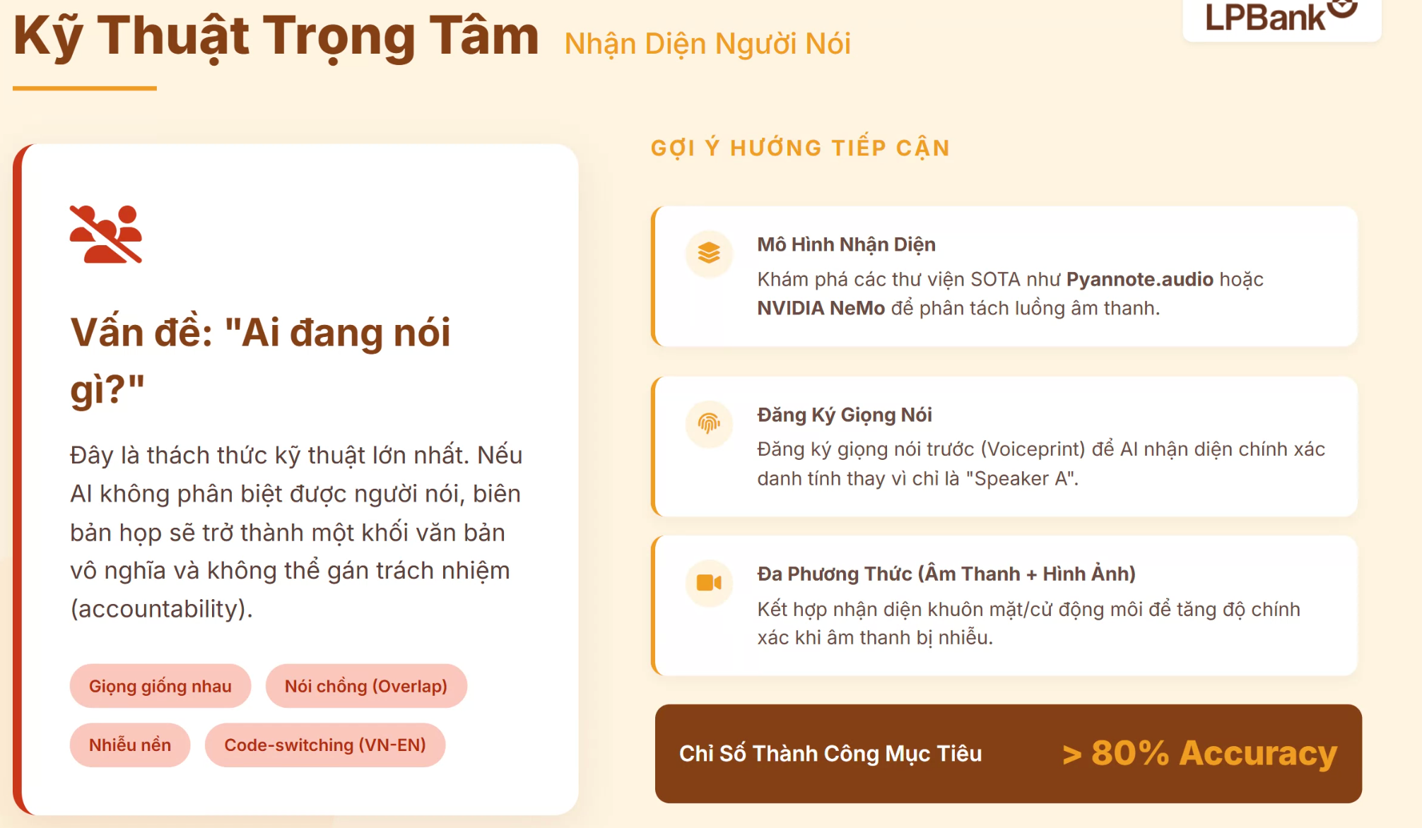 Gợi ý: Sử dụng các thư viện mã nguồn mở, đăng ký voice-print của các thành viên trước khi họp, dùng mutilmodal