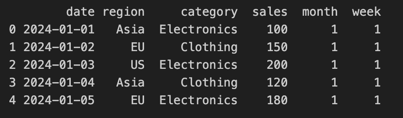 Để cho bạn thấy rõ dòng chảy của ETL, mình xây dựng một ví dụ nhỏ bằng Python. Ví dụ này mô phỏng extraction, cleaning, transformation và loading vào một bảng warehouse.