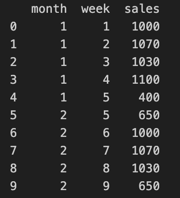 drilldown_week = df.groupby(["month", "week"])["sales"].sum().reset_index()