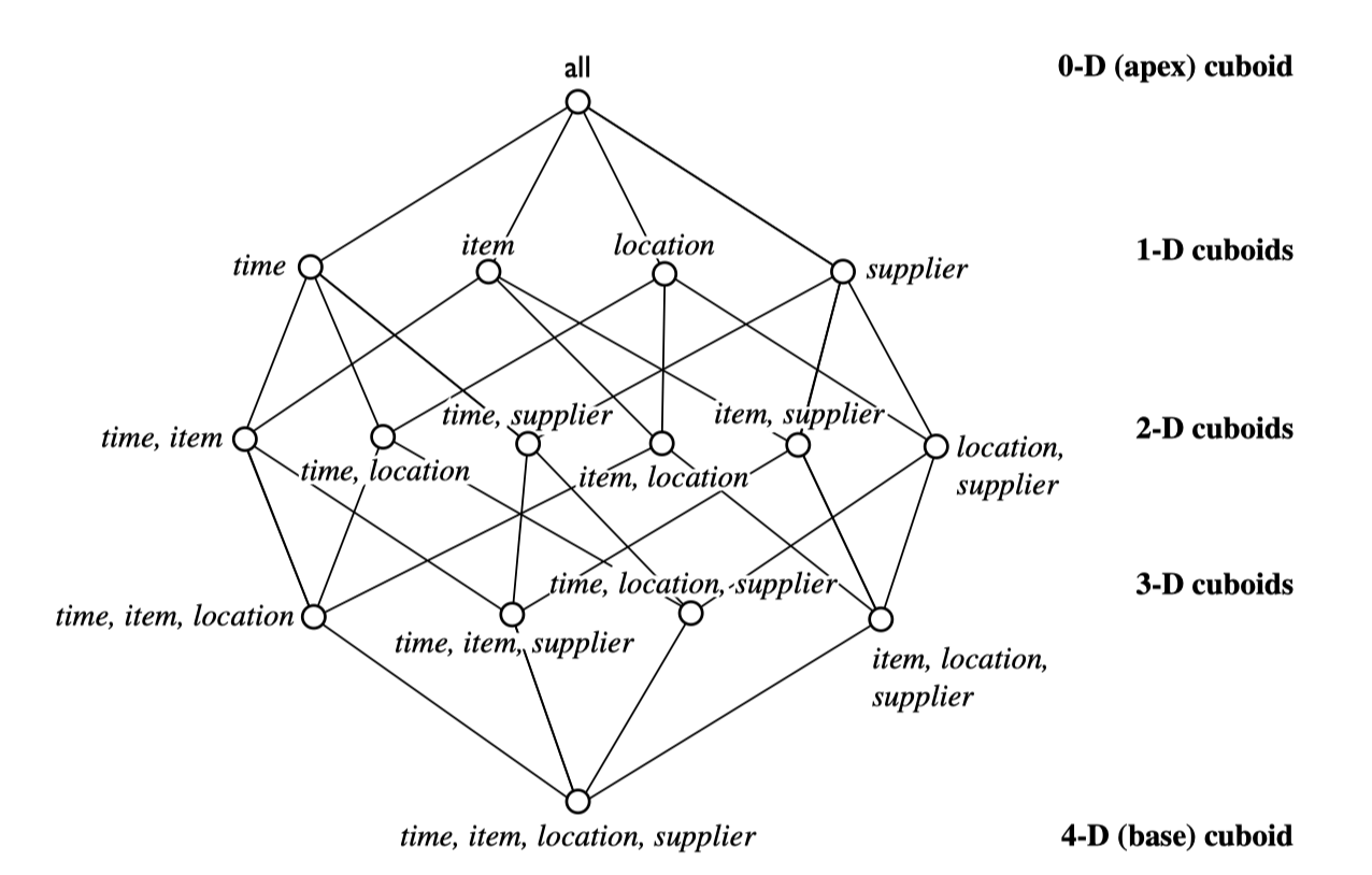 Một cube đầy đủ thực chất không chỉ có một phiên bản duy nhất. Khi xây dựng cube với n chiều, ta có tổng cộng cách kết hợp các chiều, tạo thành các cuboid từ mức chi tiết nhất đến tổng hợp nhất. Ví dụ với ba chiều như thời gian, sản phẩm và địa lý, ta sẽ có các cuboid như , , , , và cuối cùng là cuboid tổng hợp – đại diện cho một giá trị duy nhất như tổng doanh thu.